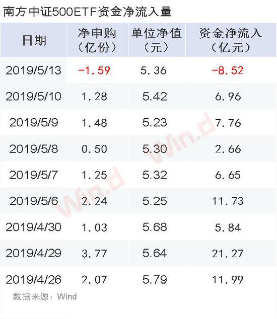 据Wind数据统计,5月13日,南方中证500ETF遭遇获得1.59亿份净赎回,当日基金单位净值为5.36亿元,以此估算出现8.52亿元资金净流出。Ahr财经新闻网