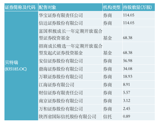 贝特瑞的申购热度,从机构参与配售的情况可以见得——11家机构参与战略配售,包括富国、招商基金的精选层公募产品、嘉实基金的资管计划,以及安信证券自营产品、北京知点投资等机构。