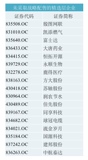 首批精选层企业的战略配售出现分化:上述两家以及观典防务(832317.OC)、颖泰生物(833819.OC)、森萱医药(830946.OC)5家企业都分别吸引了5家以上战投,而球冠电缆(834682.OC)、佳先股份(430489.OC)等17家企业此次未采取战略配售。