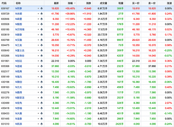 截至7月22日收盘,32只精选层个股中,除去N创远收平外,仅有10只个股收涨。其中,N同享录得55.40%的最大涨幅。而剩余的21只个股首日全部翻绿,跌幅超过20%的就有4只个股,这也意味着这21只个股在精选层交易首日全部破发。