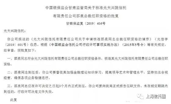 批复信息显示,根据《中国银监会信托公司行政许可事项实施办法》等有关规定,经审查,核准邵泉光大信托总裁任职资格。同时,邵泉到任后,公司要督促其加强金融理论知识学习,提高领导艺术和管理水平,坚持依法合规经营,确保各项业务稳健运行。