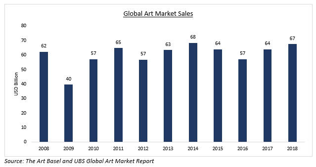 由一系列绘画,雕塑,艺术品和多样化古董组成的全球艺术产业在2018年增长了5.8%,达到674亿美元,成为全球艺术品市场第二大年。十年间,仅2014年的销售额就高达682亿美元。该行业的增长受到高端市场销售的推动。