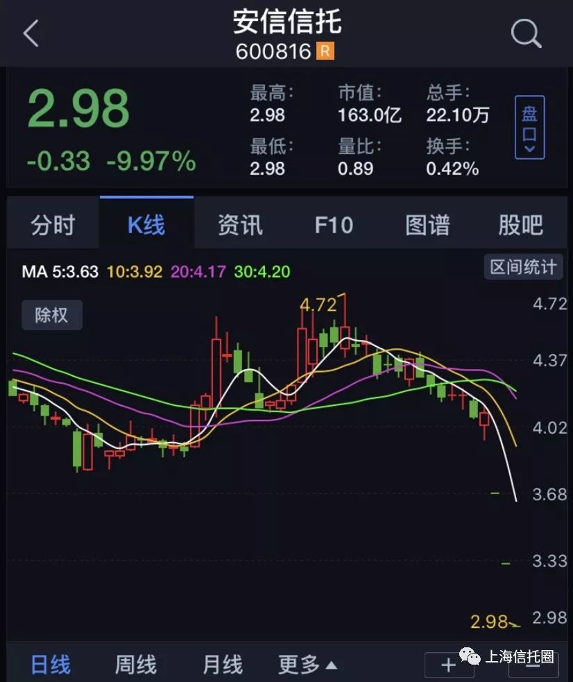 安信信托(600816.SH)今日开盘一字跌停,截至发稿,已经跌破3元大关,报收2.98元,连续3个跌停板!