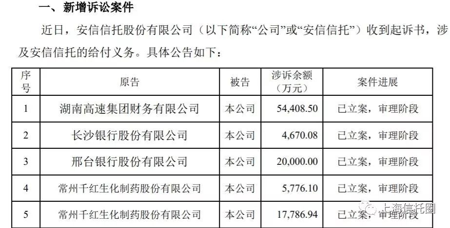 安信信托近日还收到7份起诉书,涉诉金额合计15.36亿元。包括湖南高速集团财务有限公司、长沙银行股份有限公司、邢台银行股份有限公司、常州千红生化制药股份有限公司、营口银行股份有限公司。