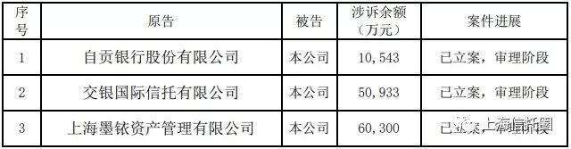 此外,除了上述7份诉书外。12月16日,安信信托还公告称,公司收到三份起诉书,分别来自自贡银行、交银国际信托和上海墨铱资产,相关涉诉案件均因信托业务中安信信托以远期受让或出具流动性支持函的形式提供保底承诺。