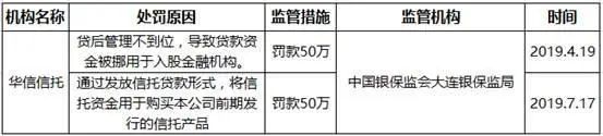 其实在过去的一年中,华信信托过得并不平静。2019年一年内华信信托因违规经营被大连银保监局处罚了两次,罚金合计为100万元。