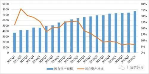从固有资产的角度看,截至2019年4季度末,68家信托公司固有资产规模达到7677.12亿元,同比增长6.73%。