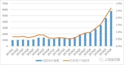 2019年4季度末,信托行业风险资产规模为5770.47亿元,较2018年末增加3548.6亿元,增幅159.71%。从风险项目数量看, 2019年4季度末,信托业风险项目个数为1547个,较2018年末增加675个。