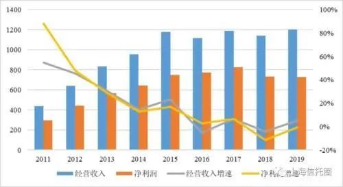净利润方面,在2018年信托业利润大幅下降的基础上,2019年末,信托业净利润增速重回正数。2018年信托业净利润有大幅回调,当年信托业净利润为731.8亿,同比下降11%。2019年4季度,信托行业利润总额727.05亿元,与2018年基本持平。