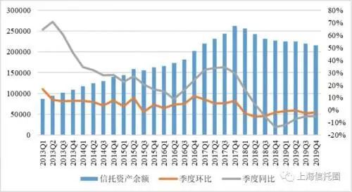 据《发展评析》数据,截止至2019年4季度末,全国68家信托公司受托资产规模为21.6万亿元,较2018年年末的22.7万亿同比下降4.85%,小于2018年同期的13.50%。