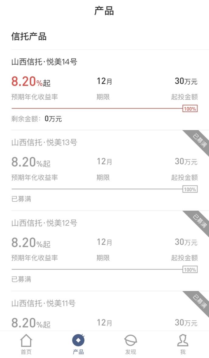 在预期年化收益率方面,主要分为三档,以“山西信托·悦美14号”产品为例,30万至100万,对应年化收益率为8.2%,100万至300万为9%,300万以上为9.2%。