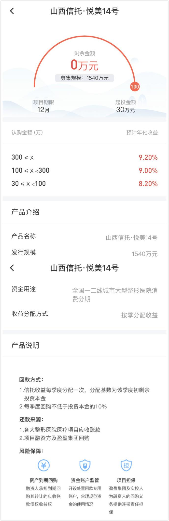 悦美系列的还款来源为各大整形医院医疗项目应收账款、项目融资方及盈盈集团回购。在风险保障方面,由融资人承担到期回购其转让的应收账款债权收益权,同时盈盈集团及实控人为融资人的回购义务提供连带责任担保。