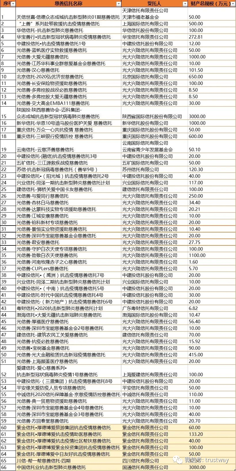 此外,为助力打赢新型冠状病毒肺炎疫情防控阻击战,保障广大人民群众生命安全和身体健康,由信托业协会倡议、国通信托担任受托人发起设立了“中国信托业抗击新型肺炎慈善信托”。信托业迅速行动,募资额达3080万元,有61家信托公司作为委托人参与捐赠。此单慈善信托尚未在全国慈善信托公开平台公示。