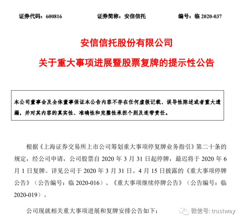 5月30日,安信信托发布公告披露了重组进展,并同时表示股票将于6月1号开市复牌。