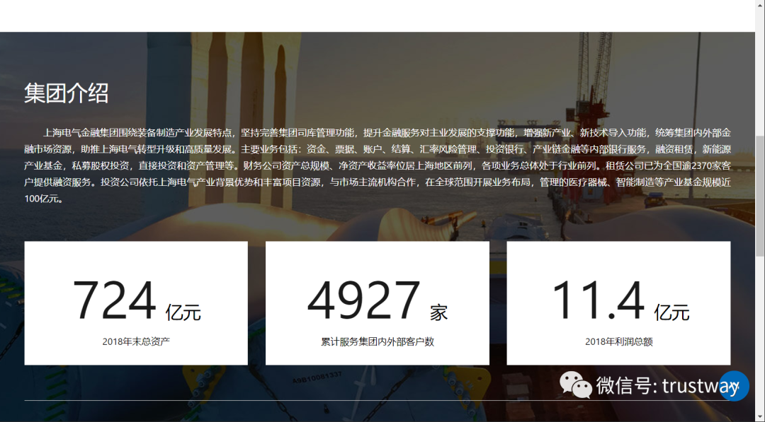 截至2018年末,上海电气金融集团总资产724亿元,累计服务集团内外部客户数4927家,2018年利润总额11.4亿元。