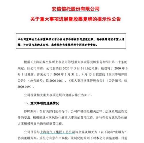 5月29日,安信信托发布关于重大事项进展暨股票复牌的提示性公告。根据公告,安信信托目前与上海电气(集团)总公司(下称上电集团)等企业及相关方协商重组方案,目前尚处于对公司的资产和风险进行尽职调查和评估阶段。重组方在公告中表示,重组能否达成将取决于与安信信托控股股东、债权人和其他方的谈判情况,存在重大不确定性。