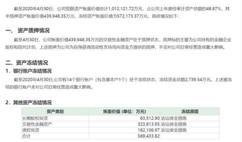 受诉讼缠身影响,安信信托的资金流动性继续承压。截至2020年4月30日,该公司受限资产账面价值总计约101.21亿元,占资产总额的比例接近五成。其中,质押资产账面价值43.99亿元,冻结资产账面价值为57.22亿元。