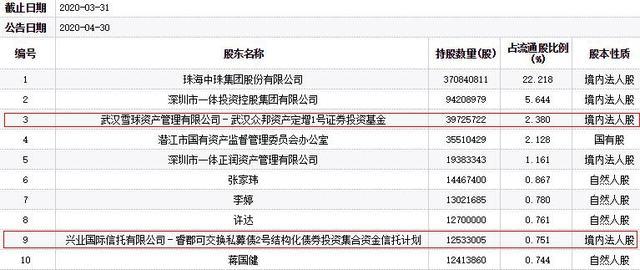 今年一季报显示,*ST中珠的前十大流通股东中包括武汉雪球资产管理有限公司旗下的武汉众邦资产定增1号证券投资基金,以及兴业国际信托有限公司旗下的睿郡可交换私募债2号结构化债券投资集合资金信托计划。截至一季度末,两只基金分别持有*ST中珠3972.57万股、1253.30万股,并位居第三和第九大流通股东。