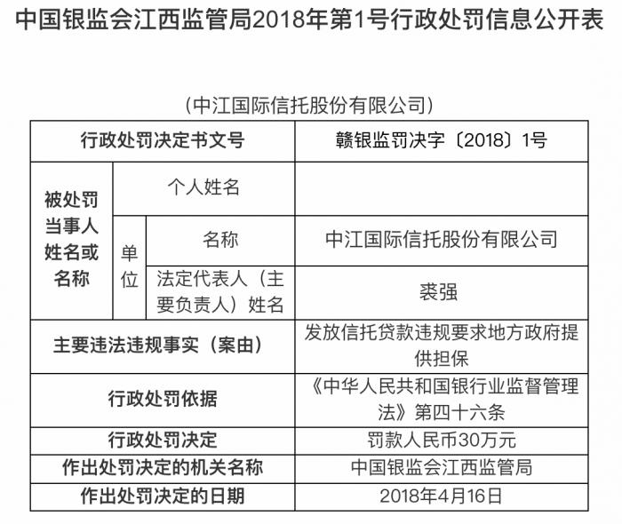 原标题:江西银保监局公布一张两年前的罚单:原中江信托干了什么被罚30万?