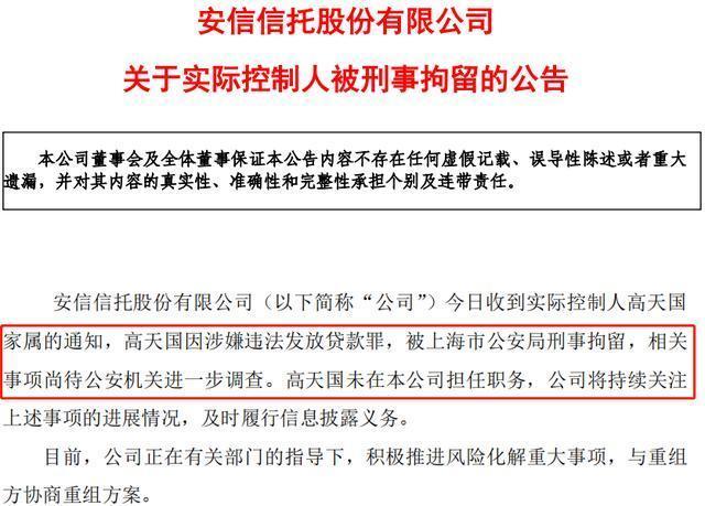 6月5日晚间,6月5日晚间,安信信托又传来一个大消息。因涉嫌违法发放贷款,安信信托实际控制人高天国被刑事拘留,相关事项尚待公安机进一步调查。