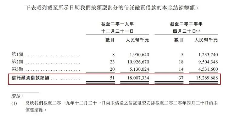 在2019年底的285.27亿元借款中,有180.07亿元来自信托融资,占比63.1%,对应融资笔数为51笔。