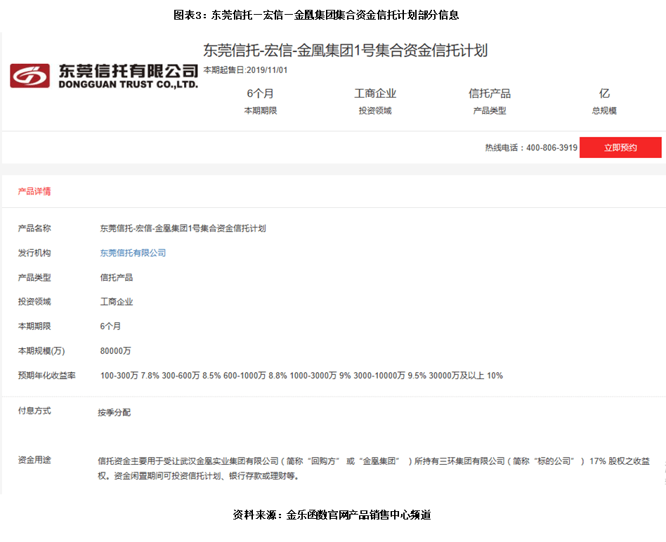 时代商学院查阅公开资料发现,东莞信托有三款信托产品涉及金凰实业和金凰珠宝,分别为东莞信托—鼎信—金凰集团集合资金信托计划、东莞信托—泰信—金凰珠宝集合资金信托计划、东莞信托—宏信—金凰集团集合资金信托计划。其中,鼎信—金凰集团集合资金信托计划的资金为16亿元,信托资金投资方向为向金凰实业增资并持股34.78%,用于收购三环集团有限公司,信托计划终止日期为今年7月26日。