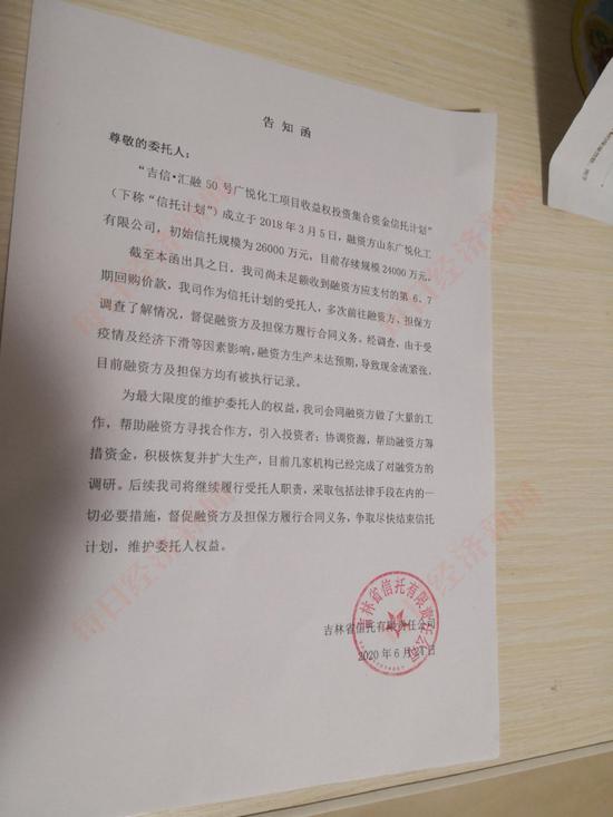 据投资人表示,其于近日收到吉林信托寄来的《告知函》。《告知函》中表示,截至该函出具之日,吉林信托尚未足额收到融资方应支付的第6、7期回购价款,该《告知函》落款日期为6月24日。