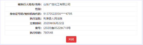启信宝资料显示,广悦化工成立于2012年10月,为青岛中银国投控股集团有限公司全资子公司。6月22日,其已经被利津县人民法院列为被执行人。
