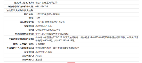 《每日经济新闻》记者查询中国执行信息公开网发现,2019年9月,广悦化工还曾被北京市门头沟区人民法院列为失信被执行人。资料显示,广悦化工应当向申请人偿还租金573.47万元及逾期利息、剩余租金3440.84万元及剩余租金逾期利息、共计4014.31万元;其还需要支付申请执行证书费用10.8万元。然而,广悦化工却全部未履行,其失信行为具体情形为:有履行能力而拒不履行生效法律文书确定义务。