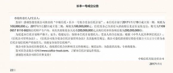 界面新闻记者获得的资料显示,2017年1月19日,中粮信托有限责任公司(下称“中粮信托”)作为受托人发起设立“中粮信托·长丰一号集合资金信托计划”(下称“长丰一号”),信托期限为2年,规模2亿元,分两期(2017年1月19日和22日)成立。招商银行北京分行为该信托计划信托财产的保管人。