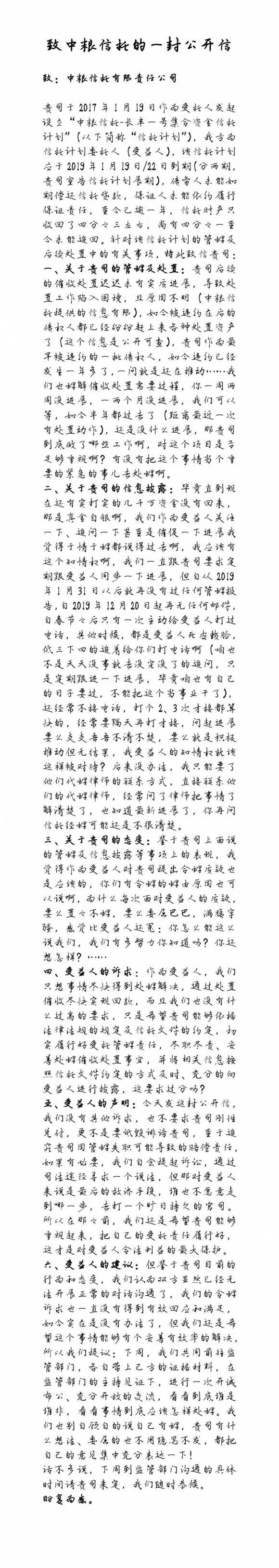 2019年3月,有自媒体发布“致中粮信托的一封信”。文章以信托计划受益人的第一人称身份,向中粮信托提出六点声明,就中粮信托“长丰一号”信托计划逾期,信托财产未能全数追回一事,质问中粮信托何以催收没有进展、何以作为最早被违约的债权人却未及时处置资产、何以不及时与受益人沟通、公开管理报告。