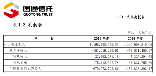 对于迟来的年报,并没有一丝丝惊喜。记者发现,截至2019年末,国通信托实现营业收入11.65亿元,同比下降9.68%;净利润5亿元,同比下降23.19%。其中,手续费及佣金净收入9.79亿元,同比下降17.31%。