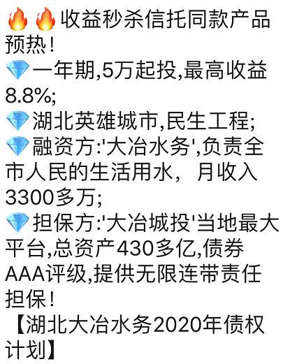“xx信托项目同款、收益更高”是定融宣传的一贯套路,在市场转一圈定融项目就被理财经理鼓吹成和信托一样的安全、收益比信托高出2%还不止的优质投资,谁不心动呢?