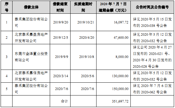 具体来看,泰禾集团旗下涉及实质性债务逾期,截至7月7日,总计约35.17亿元,具体明细如下: