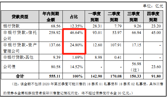 注意!泰禾集团2020年内到期债务规模555.11亿元,其中信托、资管较高成本的融资渠道占比很高,对其兑付压力是个非常大的考验。