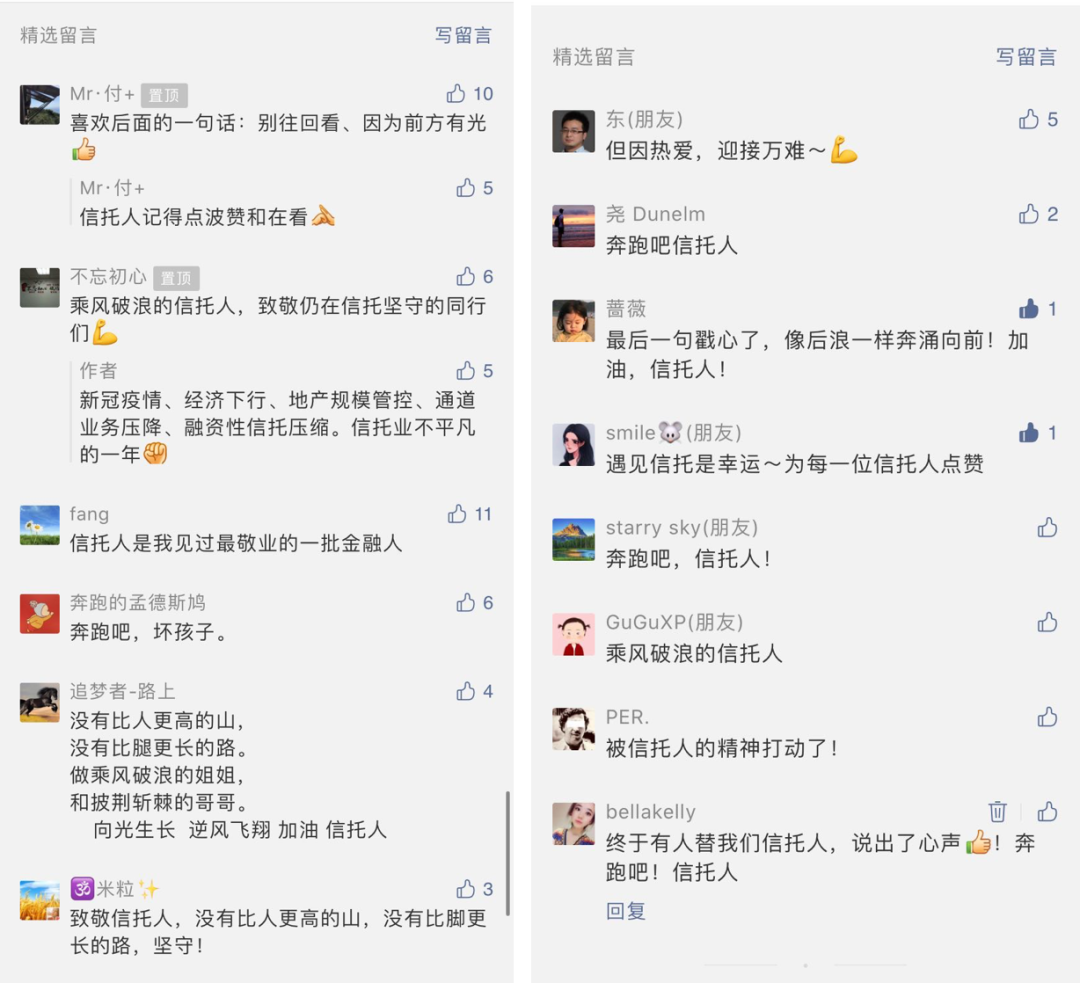 这种坚持不懈的精神,引起了信托人的共鸣,也在低沉时期为更多的信托同仁注入了精神慰藉和力量。