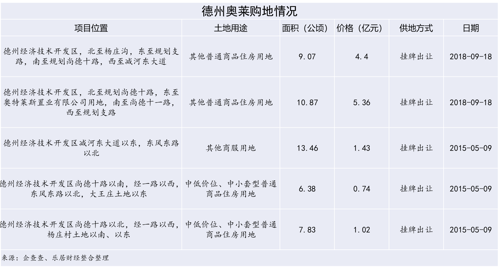 自2015年至2018年,德州奥莱对应的项目地块逐渐落地。它已以总价12.95亿元,拿下德州经济技术开发区的5副商住地块,总面积为47.61公顷;其中4副地块为住宅用地,地块面积34.15公顷。