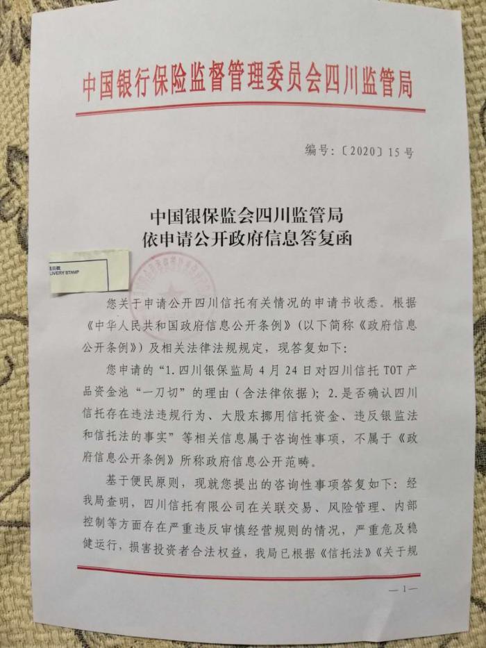 7月24日,四川银保监局给四川信托投资者的书面答复函中称,经四川银保监局查明,四川信托在关联交易、风险管理、内部控制等方面存在严重违反审慎经营的情况,严重危及稳健运行,损害投资者合法权益,四川银保监局已根据有关规定对其采取监管强制措施,后续监管措施正在推进中。