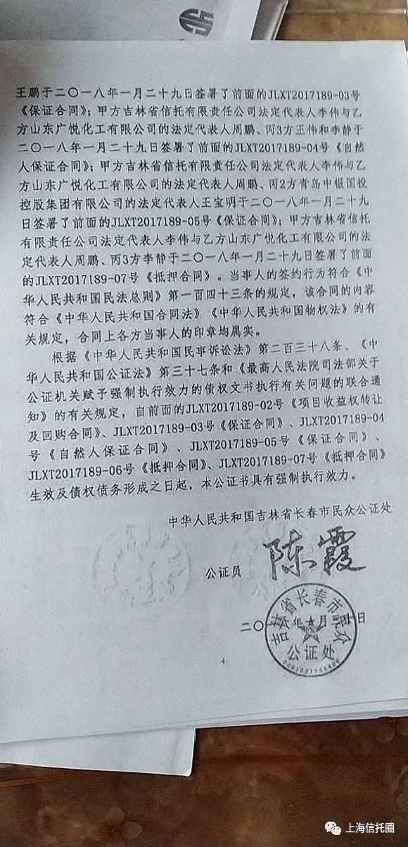 近日,有投资者向财联社记者提供了长春民众公证处出具的关于吉林信托汇融50号广悦化工项目收益权投资集合资金信托计划(简称“汇融50号”)的《具有强制执行效力的债券文书公证书》。