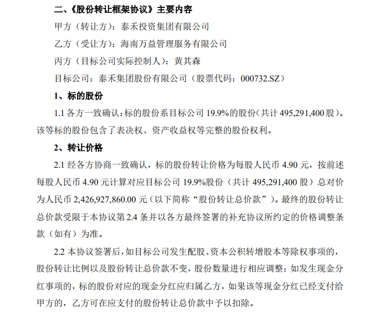 7月31日,泰禾集团发布公告,与万科下属公司签订股权转让框架协议,在满足交易前提下,转让19.9%股份,转让价格为每股人民币4.9元,对应总对价约为人民币24.3亿元。