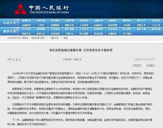 7月的最后一天晚间,央行发布《优化资管新规过渡期安排 引导资管业务平稳转型》的通知,称考虑到今年以来新冠肺炎疫情对经济金融带来的冲击,金融机构资产管理业务规范转型面临较大压力,按既有安排资管新规过渡期将于2020年底结束。为平稳推动资管新规实施和资管业务规范转型,资管新规过渡期延长至2021年底。