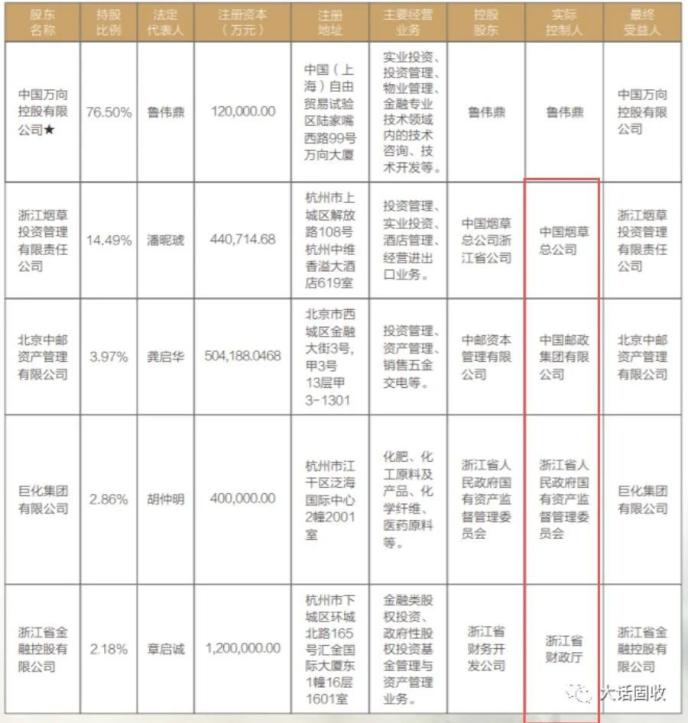 不一样的不在于大股东,而在于其他几个小股东,来头都“不小”;第二大股东浙江烟草投资,实控人是中国烟草总公司;第三大股东中国中邮,实控人是中国邮政集团;末位俩股东,实控人分别是浙江省国资委和浙江省财政厅。
