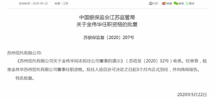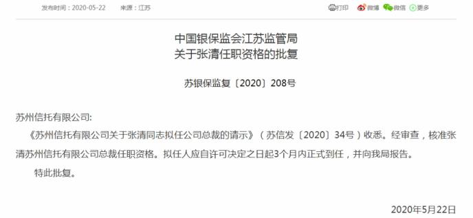 2020年5月22日,江苏银保监局核准了张清担任苏州信托总裁、金伟华担任苏州信托董事的任职资格。