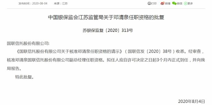 2002年8月4日,江苏银保监局核准了邓清泉担任国联信托副总经理的任职资格。