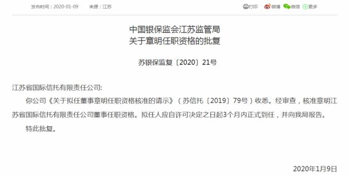 具体来看,2020年1月9日,江苏银保监局核准了章明担任江苏信托董事的任职资格。