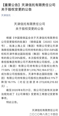 8月 24日,天津信托先后在官网和官微上发布股权变更公告,证实了上海上实(集团)有限公司(简称“上实集团”)已成功受让天津信托77.58%,成为控股股东,已经完成工商登记变更。