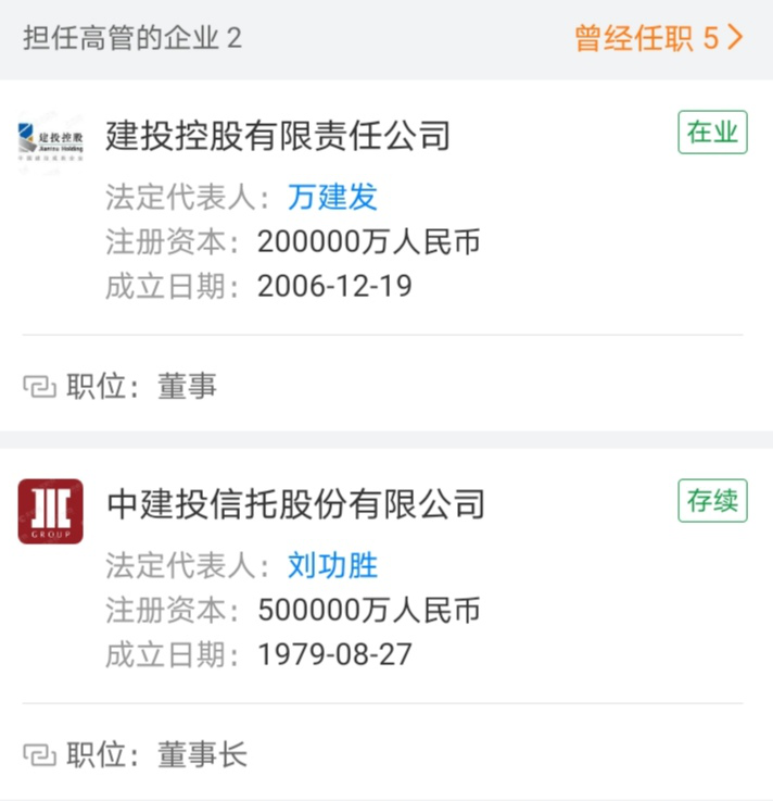 天眼查信息显示,新任董事长刘功胜除了担任中建投信托的法人代表之外,还是建投控股的董事。