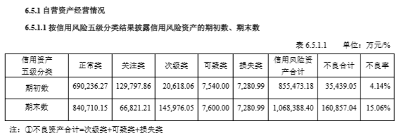 自营资产经营情况方面,不良率由期初的4.14%大幅增至期末的15.06%。
