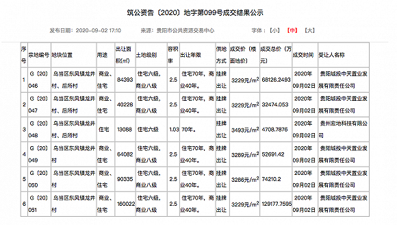 据了解,9月2日出让的6宗地块为东风镇龙井村、后所村的G〔20〕046-051号地块,为商业、住宅用地,总出让面积约45.21万方。其中, G〔20〕046-047号以及 G〔20〕049-051号地被贵阳城投中天置业以总价超35亿元竞得,G〔20〕048号地被贵州宏地科技有限公司(宏德置业)以总价约4708万元竞得。