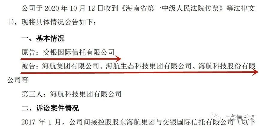 在这起诉讼中,交银国际信托是原告,海航集团、海航生态科技集团有限公司为被告;海航科技为海航集团提供担保成为共同被告;海航科技的直接控股股东海航科技集团有限公司为第三人。